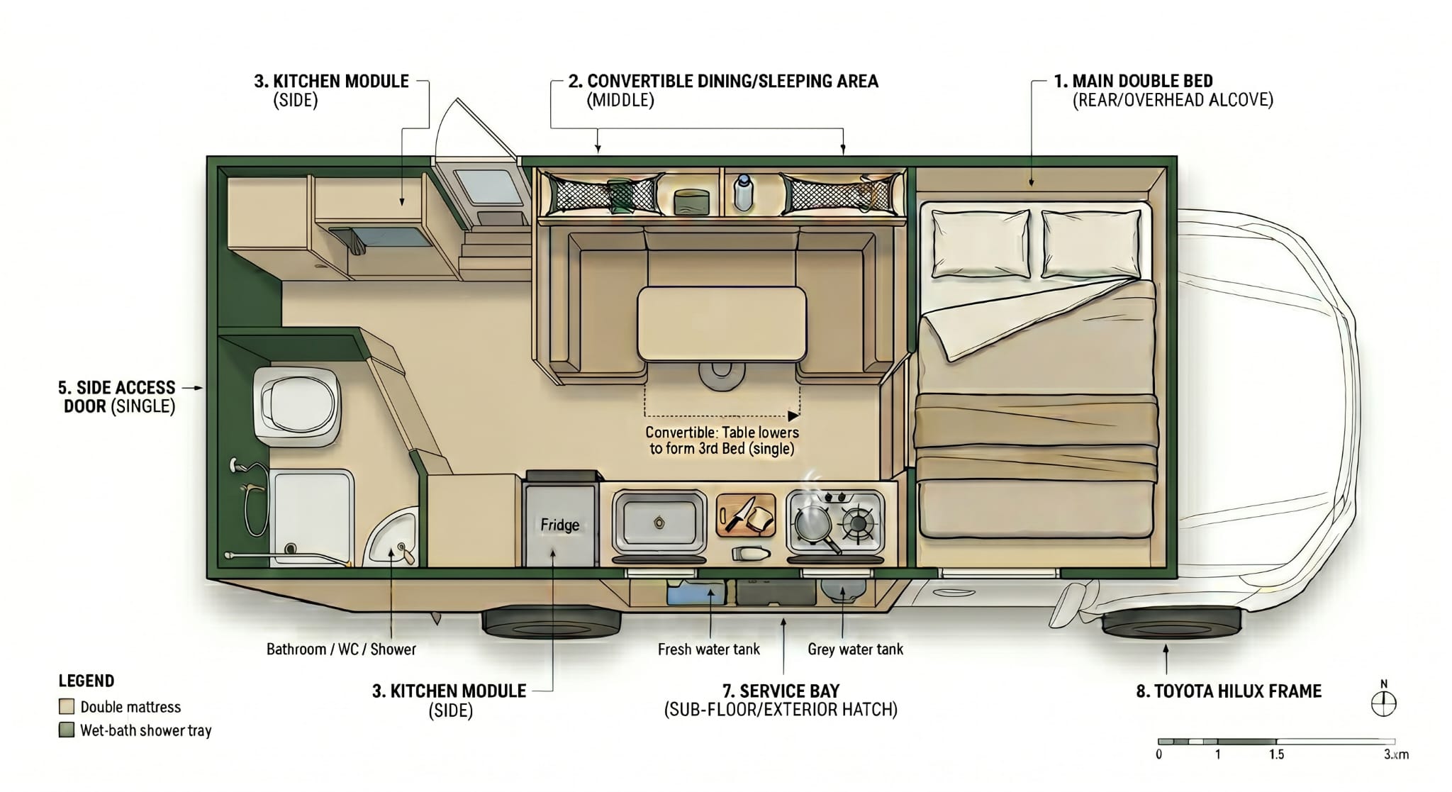 The Adventure Vehicle is for explorers who want to cover serious ground without being weighed down. Compact and capable, it punches well above its size on technical terrain. A rooftop tent gives you a commanding sleep while keeping the load low. Ideal for a duo pushing hard across Patagonia — you move fast, camp anywhere, and wake up exactly where you stopped.